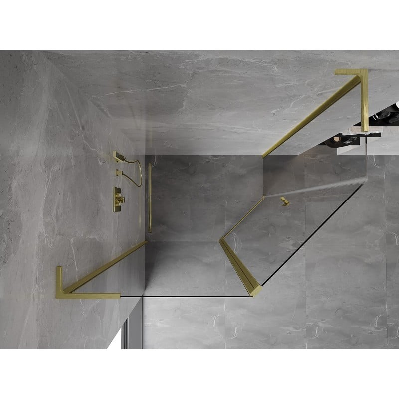 Špecifikácia produktu: Rozmer: 90x80 cm (dvere 90 cm, stena 80 cm) Výška: 200 cm Strana montáže: Univerzálny Vchod: Dvere s otočnými pántami Farba skla: Priehľadná Povrchová úprava: Kartáčované zlato Profil: Hliník Stabilizátor v tvare L: Nerezová oceľ Typ skla úprava pre ľahké čistenie Nastaviteľná šírka Možnosť inštalácie na sprchovú vaničku alebo dlaždice Mechanizmus pre zdvíhanie a spúšťanie dverí Magnetický prúžok a elastomérové tesnenie pre odtok vody Hliníkový prah tesnenia dverí