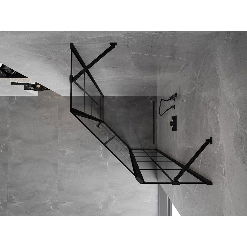 Špecifikácia produktu: Rozmer: 90x90 cm (pravé dvere 90 cm, stena 90 cm) Výška: 200 cm Strana montáže: Pravá Vchod: Dvere s výklopnými krídlami Farba skla: Čierna mriežka Povrchová úprava: Čierna Profil: Hliník Konzola: Nehrdzavejúca oceľ Typ skla: Tvrd ľahké čistenie Nastaviteľná šírka Možnosť montáže na sprchovú vaničku alebo dlaždice Mechanizmus zdvíhania a spúšťania dverí Magnetický prúžok a elastomérové tesnenie pre odtok vody Hliníkový prah tesnenia dverí
