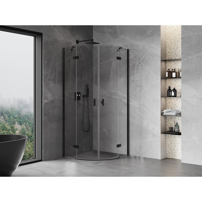 Špecifikácia produktu: Rozmer: 100x100 cm Výška: 200 cm Polomer zakrivenia R55 Strana montáže: Univerzálny Vchod: Dvere s otočnými pántami Farba skla: Priehľadná Povrchová úprava: Čierna Profil: Hliník Konzola: Nerezová oceľ Typ skla: Tvrdené Hrúbka s hrúbkou šírka Možnosť inštalácie na sprchovú vaničku alebo dlaždice Mechanizmus na zdvíhanie a spúšťanie dverí Mosadzné pánty v jednej rovine so sklenenou tabuľou Magnetický prúžok a elastomérové tesnenie na odvod vody Hliníkový prah tesnenia dverí