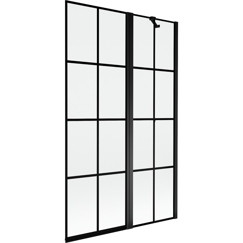 Špecifikácia produktu: Šírka: 110 cm Výška: 150 cm Typ: 2-krídlové Strana montáže: Pravé Typ: Pohyblivé/Výklopné Typ skla: Tvrdené Farba skla: Čierna mriežka Hrúbka skla: 6 mm Povrchová úprava: Čierna Povlak pre ľahké čistenie Nastaviteľná šírka častí: pevné steny a pohyblivého krídla
