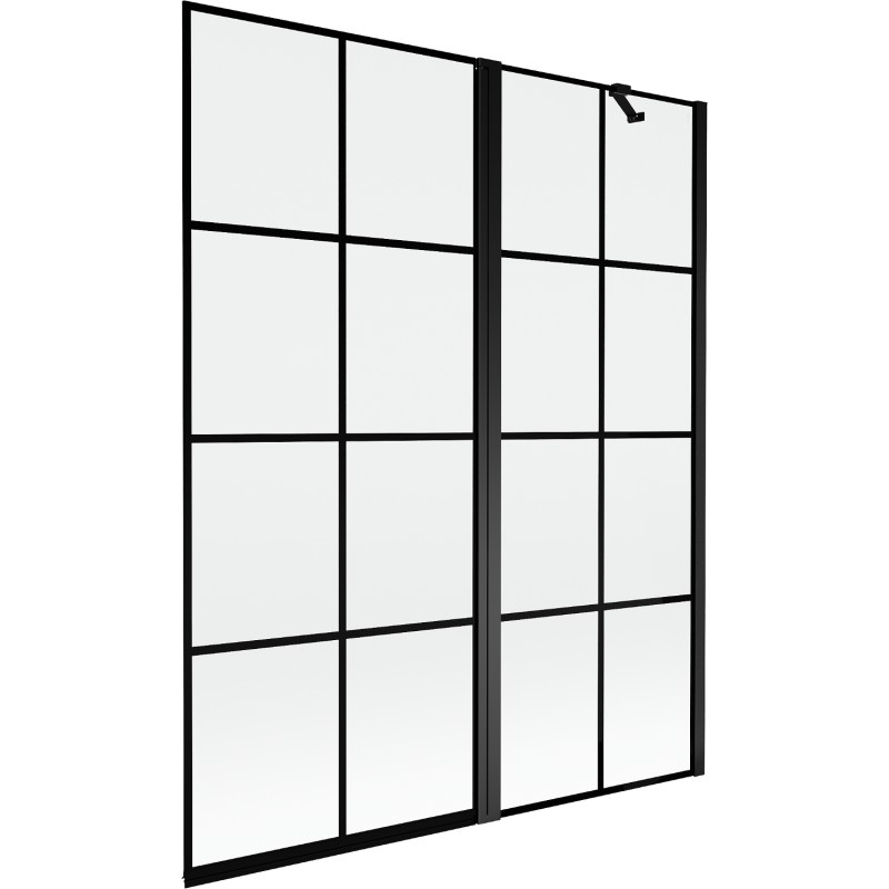 Špecifikácia produktu: Šírka: 140 cm Výška: 150 cm Typ: 2krídlové Strana montáže: Pravé Typ: Pohyblivé/Výklopné Typ skla: Tvrdené Farba skla: Čierna mriežka Hrúbka skla: 6 mm Povrchová úprava: Čierna Povlak pre ľahké čistenie Nastaviteľná šírka častí: pevné steny a pohyblivého krídla