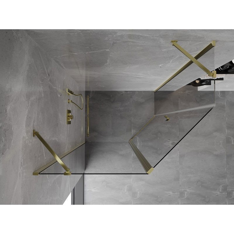 Špecifikácia produktu: Rozmer: 100x80 cm (dvere 100 cm, stena 80 cm) Výška: 200 cm Strana montáže: Univerzálny Vchod: Dvere s výklopnými krídlami Farba skla: Priehľadná Povrchová úprava: Zlatá Profil: Hliník Konzola: Nerezová oceľ Typ skla: pre ľahké čistenie Nastaviteľná šírka Možnosť montáže na sprchovú vaničku alebo dlaždice Mechanizmus zdvíhania a spúšťania dverí Magnetický prúžok a elastomérové tesnenie pre odtok vody Hliníkový prah tesnenia dverí
