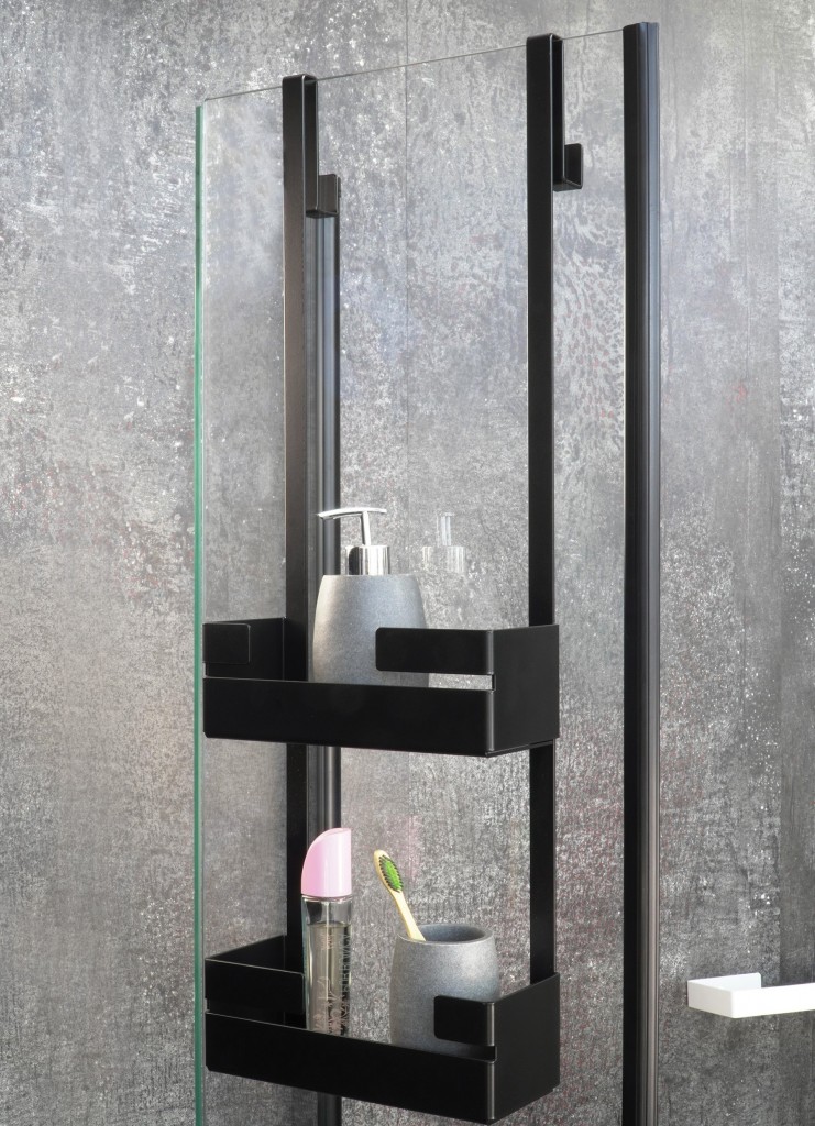 Závesná polica do sprchového kúta sa skladá z dvoch prelamovaných poličiek na kozmetiku a dvoch háčikov na uteráky alebo župan. Je ideálny do modernej kúpeľne zariadenej v minimalistickom štýle. Je vyrobená z 2,5 mm ocele, určená na zavesenie do walk-in zásten alebo na sprchovací kút s pevnou stenou. Celú sériu MOKKO navrhli Michał Łoj a Kasia Łogwinienko a bola ocenená nábytkovým diamantom 2020