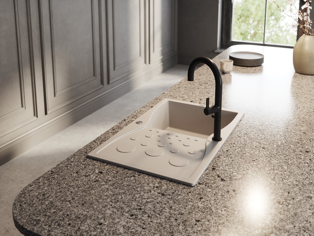 Drezy Molokin, dostupné v elegantnej béžovej, čiernej a šedej farbe, sú perfektným riešením pre tých, ktorí hľadajú kombináciu vycibreného dizajnu a praktickosti. Vďaka svojej decentnej estetike sa dokonale hodí do moderných aj klasickejších kuchýň a dodávajú im nadčasovú eleganciu. Jedným z charakteristických prvkov série Molokin je unikátna odkvapkávacia lišta s motívom kruhov rôznych veľkostí. Tento dekoratívny detail slúži aj praktickému účelu - umožňuje hladký odtok vody a zanecháva povrch suchý a hygienickejší. Toto riešenie sa premieta do väčšieho pohodlia pri každodennom používaní. Drezy sú vyrobené z odolného a odolného žulového kompozitu, ktorý zaisťuje odolnosť voči vysokým teplotám, tepelným šokom, poškriabaniu a zmene farby. To znamená, že získate produkt, ktorý si po mnoho rokov zachová svoj bezchybný vzhľad a kvalitu. Jemne zaoblené hrany, obojstranný dizajn a minimalistický tvar robí z drezu Molokin prispôsobivý rôznym usporiadaním kuchýň a individuálnym preferenciám užívateľov. Jeho všestrannosť zaručuje perfektné zapadanie do mnohých štýlov interiéru – od industriálneho až po škandinávsky. Pokiaľ je pre vás dôležitá estetika, funkčnosť a ľahké čistenie, bude drez Molokin perfektnou voľbou. Tento produkt je navrhnutý s ohľadom na moderné potreby – nielenže vyzerá krásne, ale predovšetkým zjednodušuje každodenné kuchynské práce.