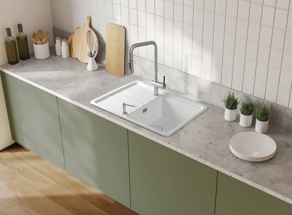 Jednomiskový drez s odkvapkávačom série MOMI je vyrobený je vyrobený z kvalitnej keramiky. Vďaka tomu odoláva vysokým teplotám a ich rýchlym zmenám. Navyše časom nestráca farbu a tlmená elegantná farba sa skvele hodí k ostatným prvkom výbavy. Odkvapkávač slúži na odkladanie umytého riadu alebo zeleniny, profilovaný povrch účinne odvádza stekajúcu vodu. Súprava obsahuje priestorovo úsporný sifón Space-Saver , ktorý umožňuje vytvoriť v skrini ďalšie miesto pre kôš na triedenie odpadu alebo čistiace prostriedky.