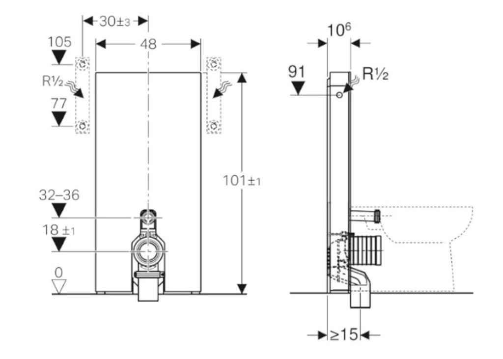 - pre stojace WC s odpadovým kolenom P as výškou prívodu splachovacej vody 32–36 cm od podlahy (EN 33)