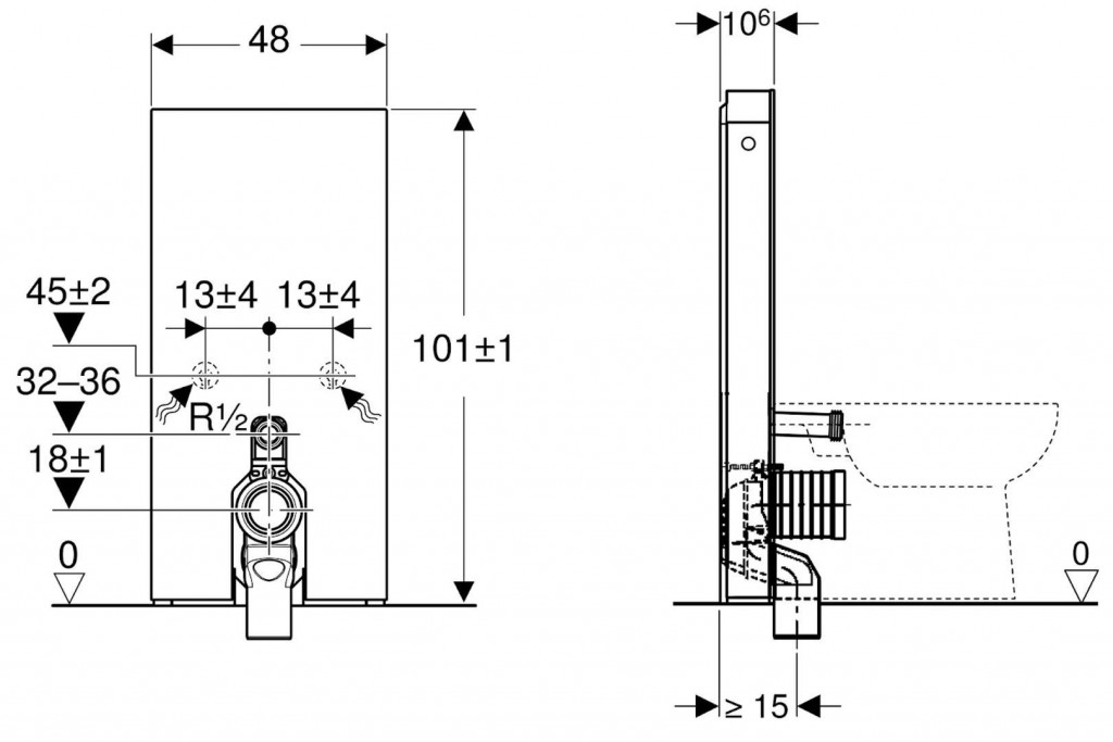 - Pre stojace WC s odpadovým kolenom P as výškou prívodu splachovacej vody 32-36 cm od podlahy (EN 33)