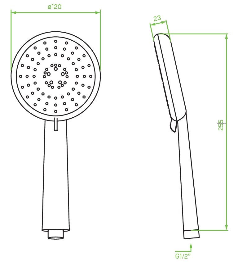 Plastová ručná sprchová hlavica s rozmermi 255 × 120 mm s univerzálnym pripojením 1/2". Vybavená gumovými tryskami, ktoré uľahčujú odstránenie vodného kameňa a zaisťujú dlhodobý komfort používania.