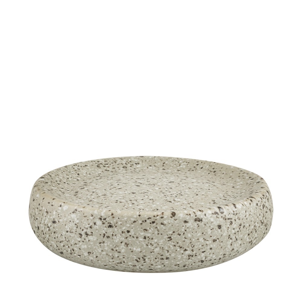 Miska na mydlo zo série Hermida v teracovom štýle. Je vyrobená z kameniny s hladkou a na dotyk príjemnou textúrou. Pieskovo béžová miska na mydlo s bielymi a hnedými škvrnami, ktoré jej dodávajú štýl a charakter. Ľahko sa udržuje v čistote.