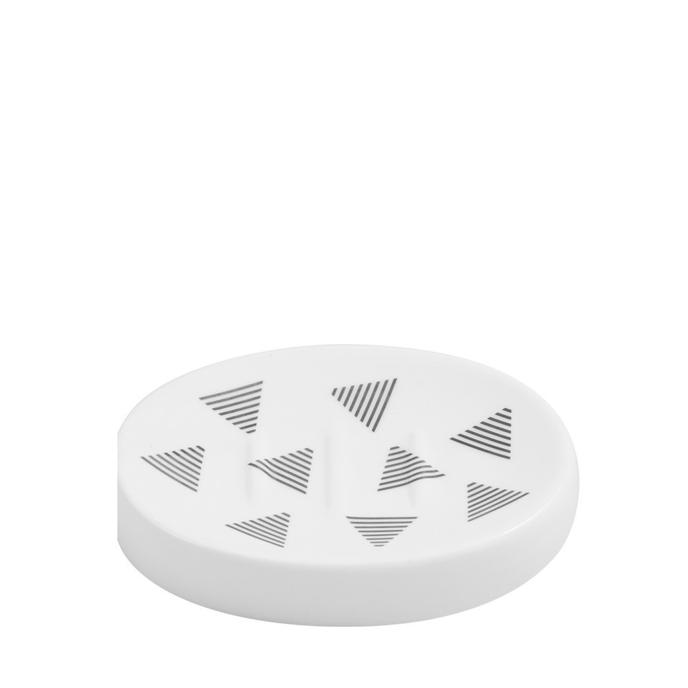 Miska na mydlo z porcelánu - séria VALENTINO. Biela farba s motívom čierneho pruhovaného trojuholníka.