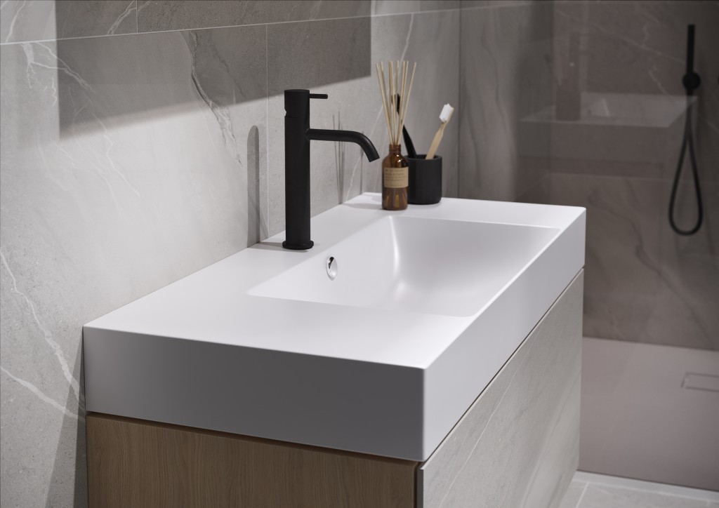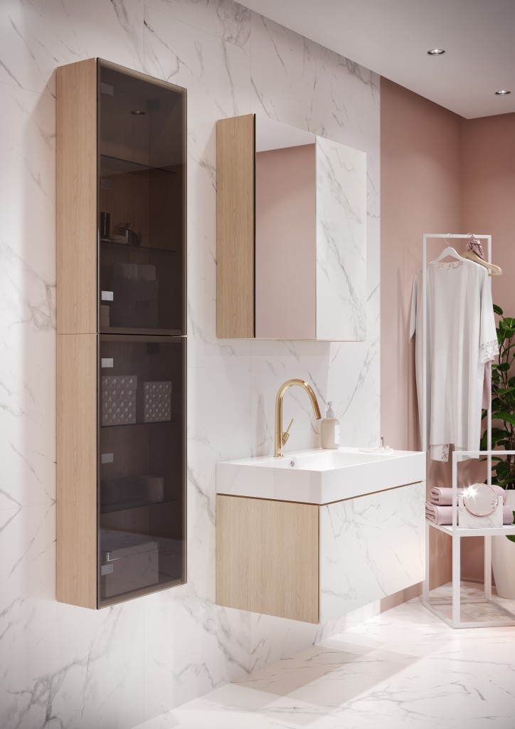 Rad INVERTO od spoločnosti CERSANIT ponúka kúpeľňové skrinky s čelami z veľkoformátových keramických dosiek s frézovanými okrajmi z bieleho mramoru a sivého kameňa, v kombinácii s korpusom v odtieňoch chladného duba.
