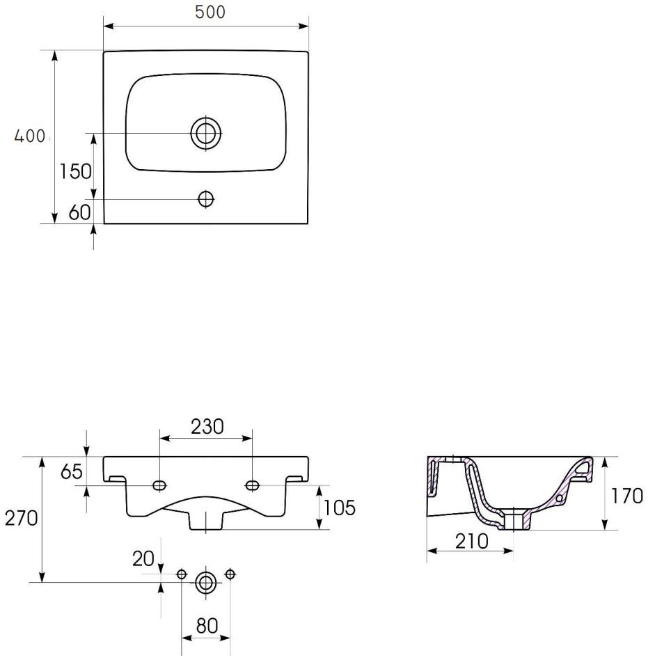 Nábytkové keramické umývadlo MODUO 50 s prepadom a jedným stredovým otvorom pre batériu. Možno inštalovať len na stenu s ozdobným sifónom alebo kombinovať so skrinkami radi MODUO, STILLO, CITY, COLOR, LARA, CREA, SMART.
