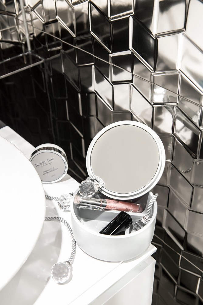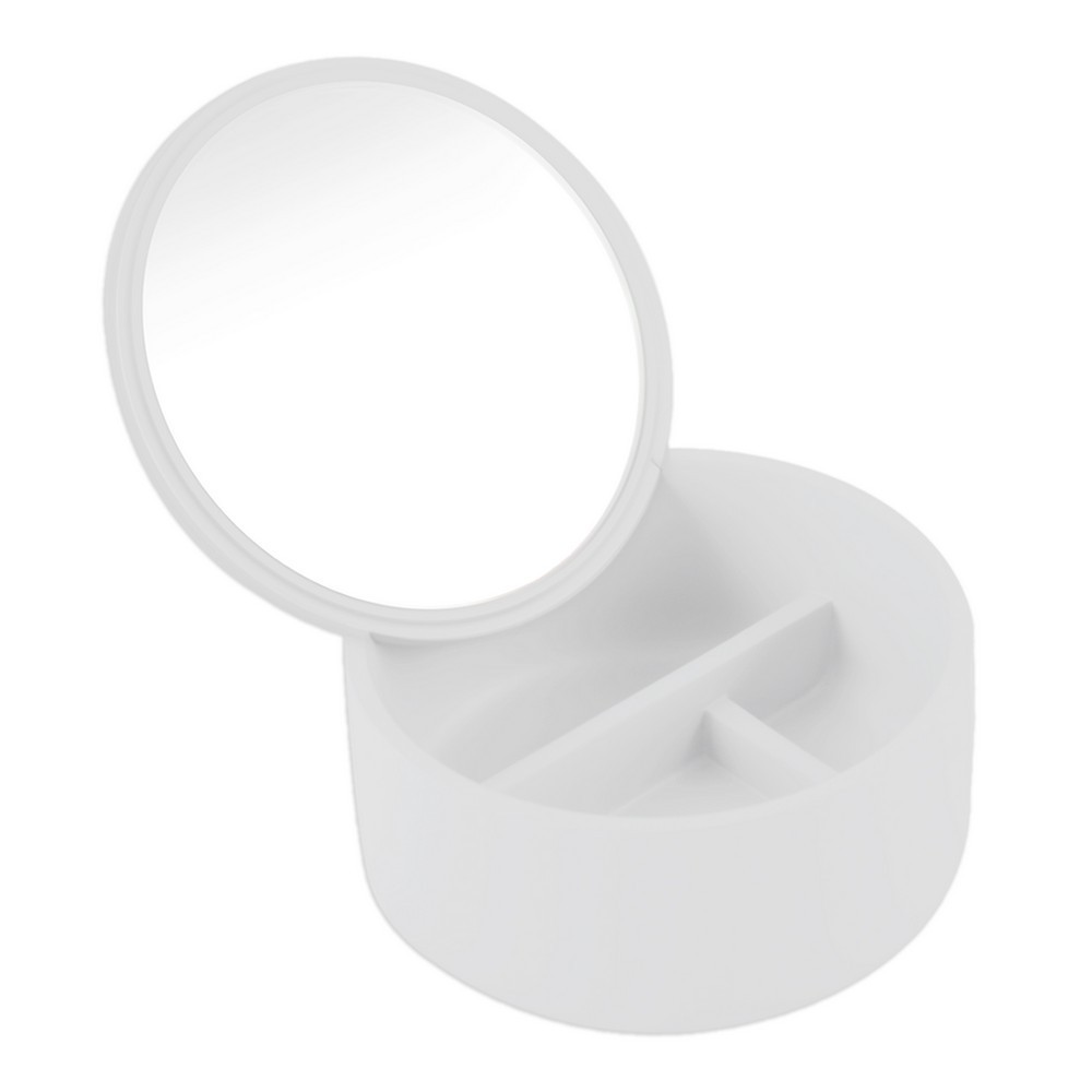 Praktická biela nádoba so zrkadielkom. Veko nádoby je opatrené zrkadielkom, ktoré je možné pohodlne umiestniť na špeciálne pripravené miesto v nádobe. Vnútri sú priehradky napr. na šperky. Ideálna do kúpeľne aj na toaletný stolík.