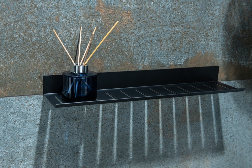 Dlhá kúpeľňová polička z čierno lakovaného hliníka s lesklou povrchovou úpravou. Inštalácia prebieha na samolepiacu 3M pásku s vysokou lepiacou silou. Jeho maximálna nosnosť je 4 kg.