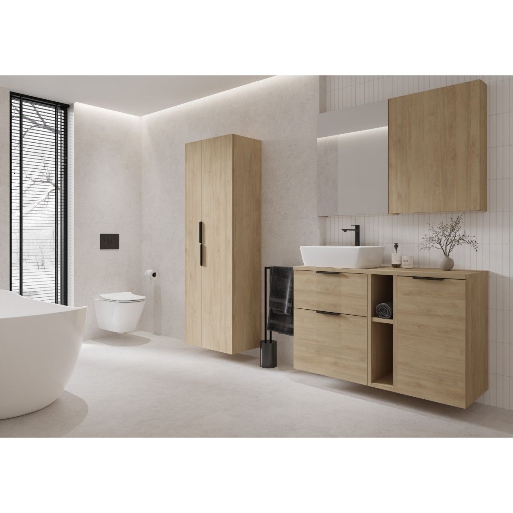 Nástenná skrinka s nábytkovým čelom je ideálnym riešením na prehľadné uloženie drobnej kozmetiky či kúpeľňových doplnkov. Vnútri sa nachádzajú tri praktické police, ktoré umožňujú efektívnu organizáciu priestoru. Skrinka je vybavená bezúchytkovým otváraním dvierok a systémom tlmeného zatvárania pre tichú a komfortnú prevádzku. Čelo aj korpus sú vyrobené z odolnej laminovanej drevotriesky, ktorá zaisťuje dlhú životnosť a jednoduchú údržbu.