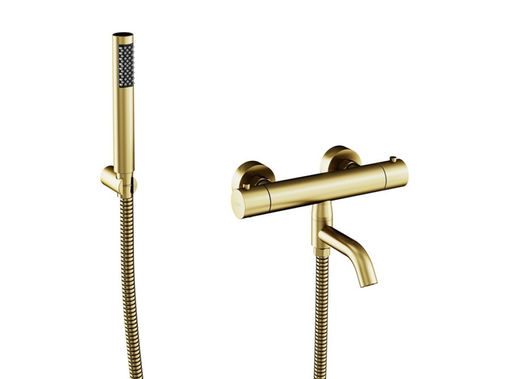 Jedinečný nástenný sprchový aj vaňový termostatický set s príslušenstvom VEO zlatá brúsená farba . Kompletné riešenie pre vašu kúpeľňu. Set obsahuje termostatickú batériu, vývod zo steny s držiakom, ručnú sprchu a hadicu . Dodávame v šiestich farbách a to lesklý chróm , čierna, grafitová, zlatá, zlatá brúsená alebo zlatá lesklá.