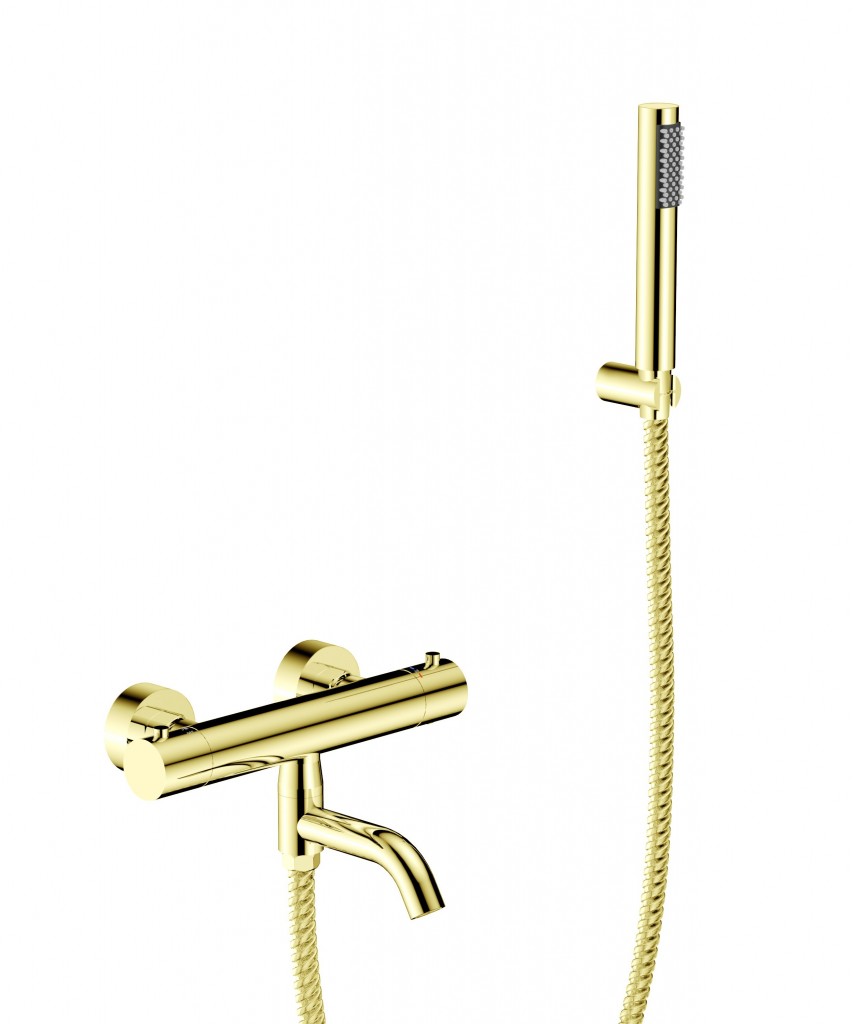 Jedinečný nástenný sprchový aj vaňový termostatický set s príslušenstvom VEO zlatá lesklá farba . Kompletné riešenie pre vašu kúpeľňu. Set obsahuje termostatickú batériu, vývod zo steny s držiakom, ručnú sprchu a hadicu . Dodávame v piatich farbách a to lesklý chróm , čierna, grafitová, zlatá alebo zlatá lesklá.