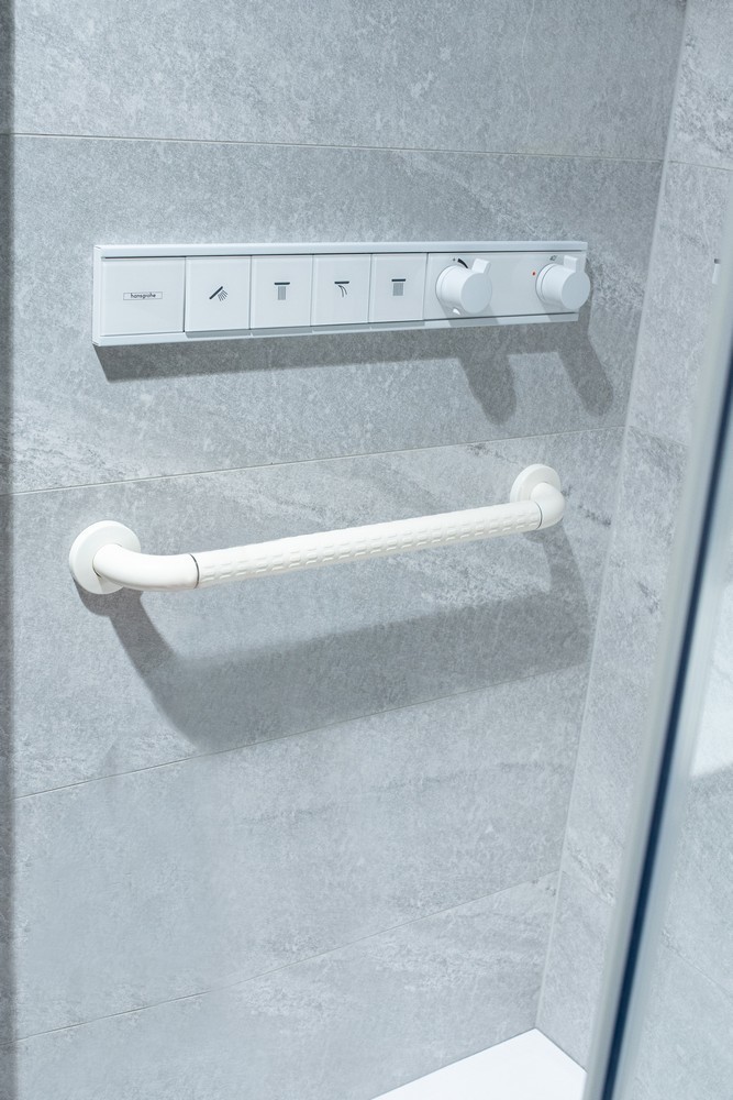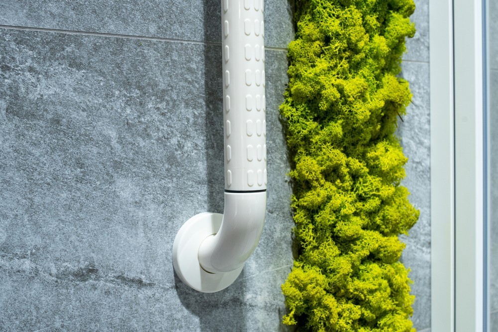 Kúpeľňové madlo z ocele potiahnuté ABS plastom. Špeciálne výstupky na jeho povrchu poskytujú bezpečnejší úchop. Má certifikát PZH a certifikát CE. Súčasťou balenia je montážny balíček.