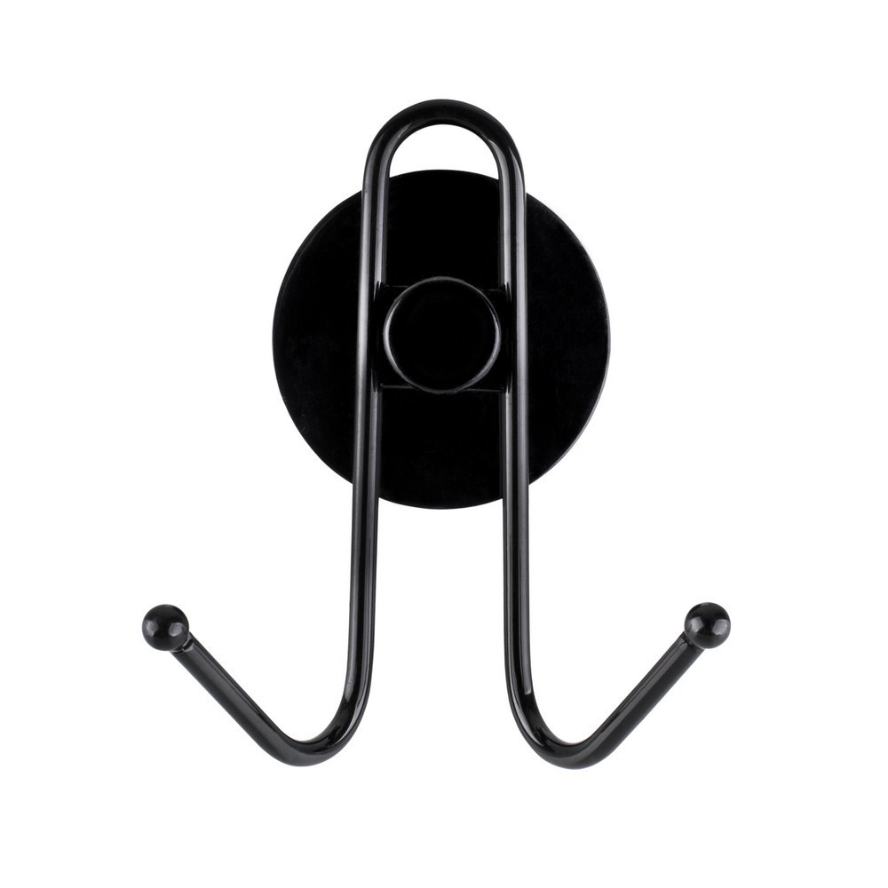 Nástenný vešiak s dvoma háčikmi je vyrobený z čierno lakovanej ocele s lesklou povrchovou úpravou.