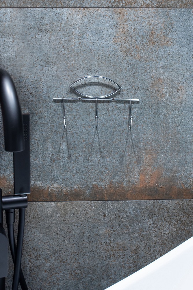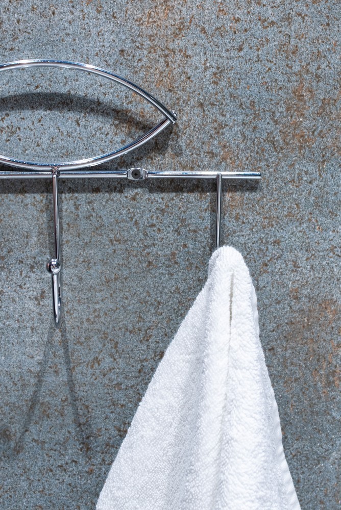 Nástenný vešiak z chrómovaného drôtu s ozdobným očkom. Montáž na stenu sa vykonáva pomocou skrutiek a hmoždiniek.