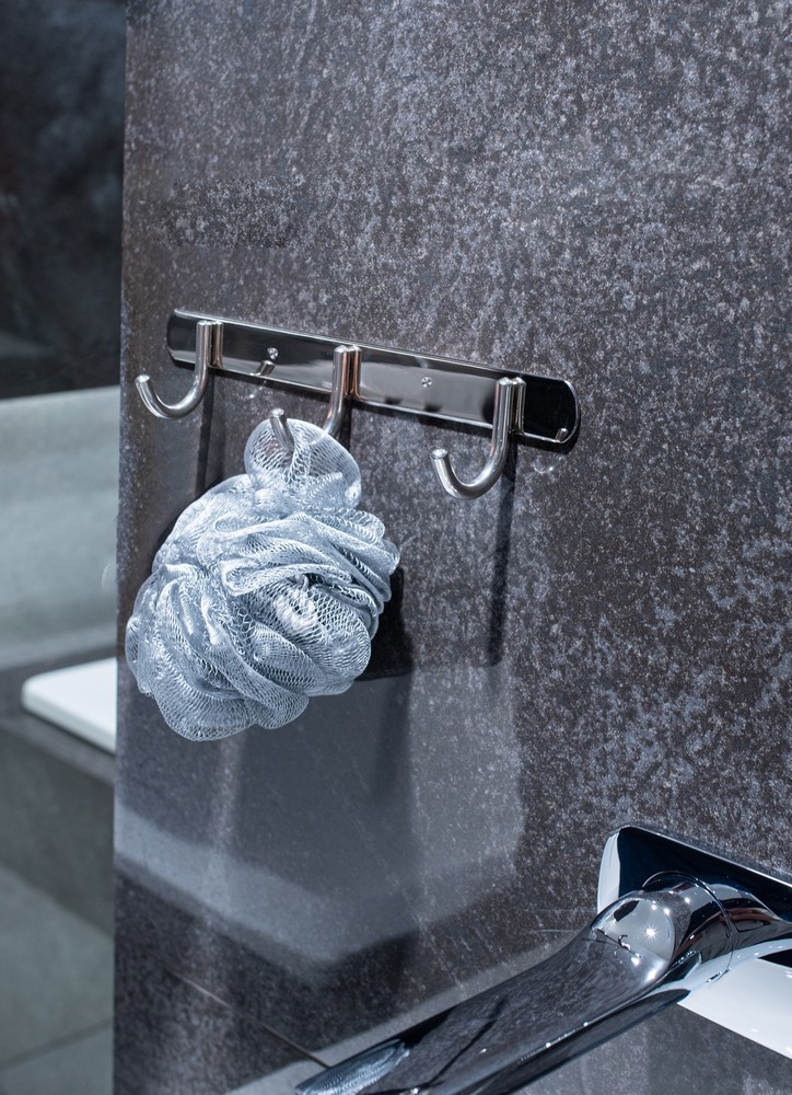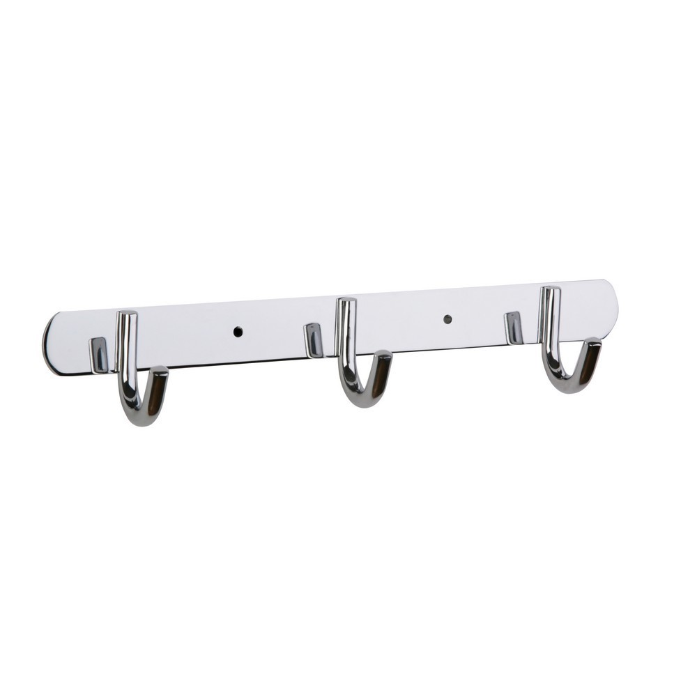 Univerzálny, trojitý kúpeľňový vešiak z nerezovej ocele. Nástenný vešiak sa montuje pomocou dvoch skrutiek a hmoždiniek, ktoré sú súčasťou balenia.