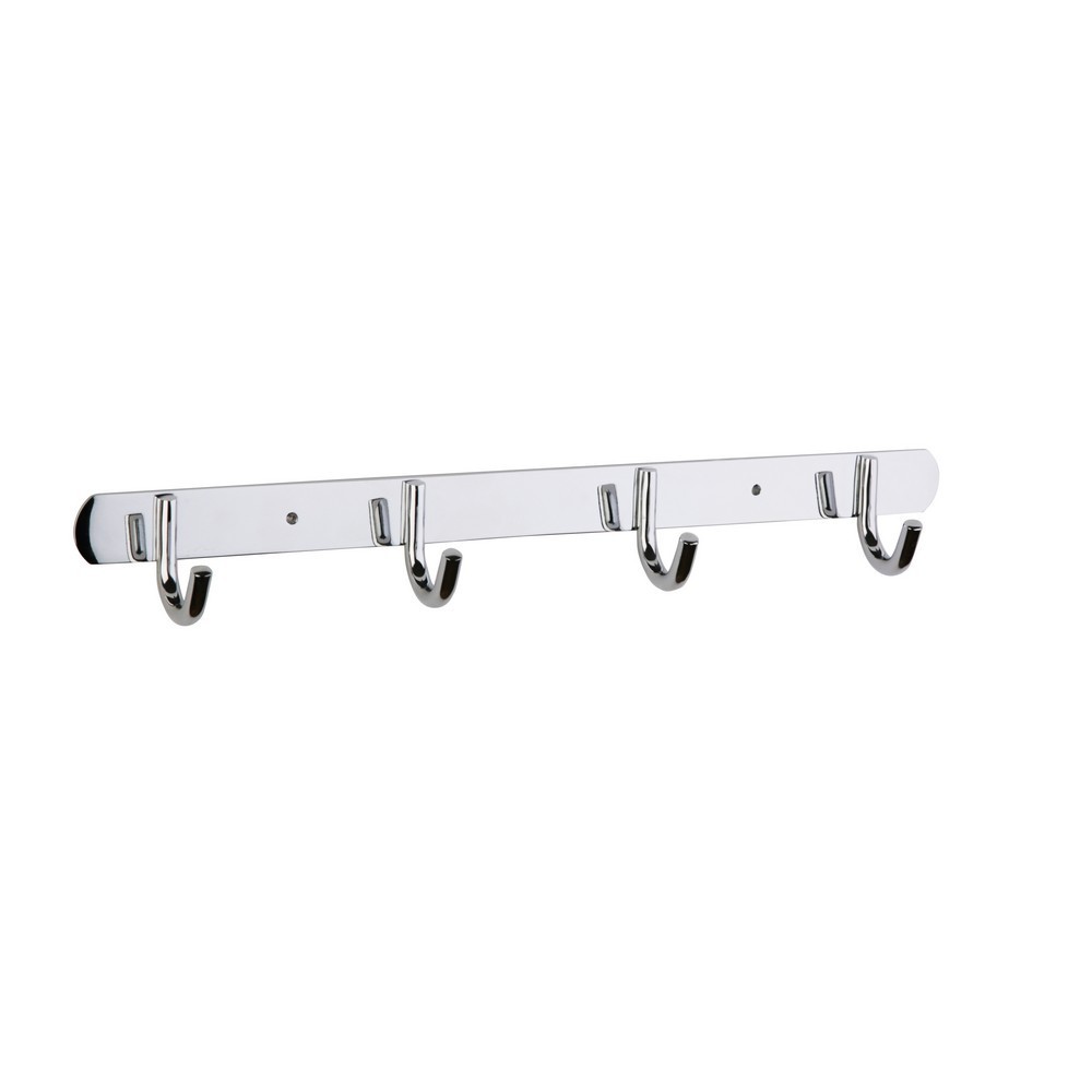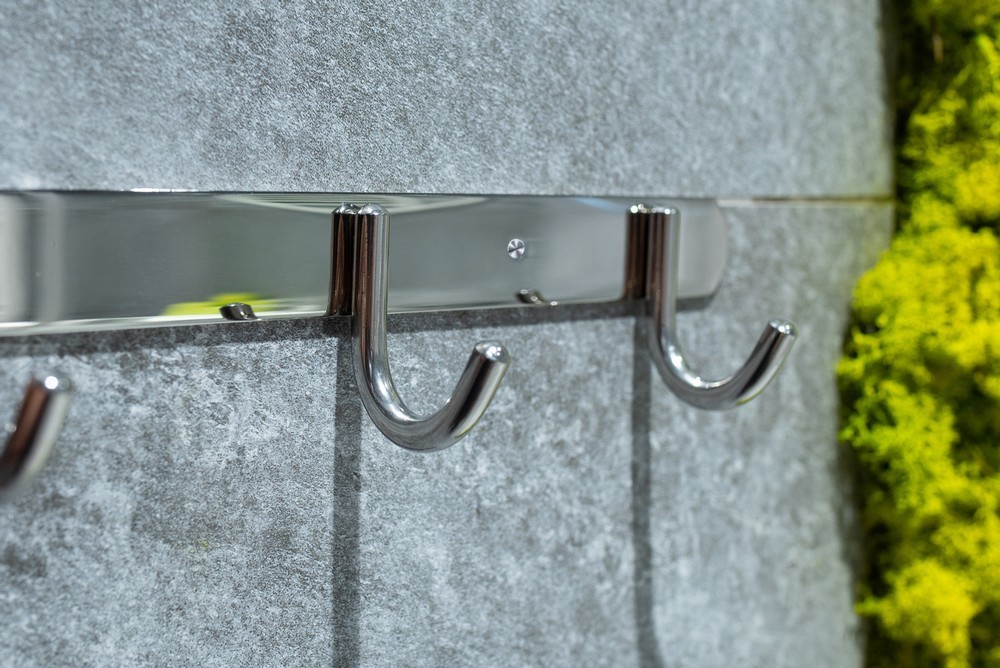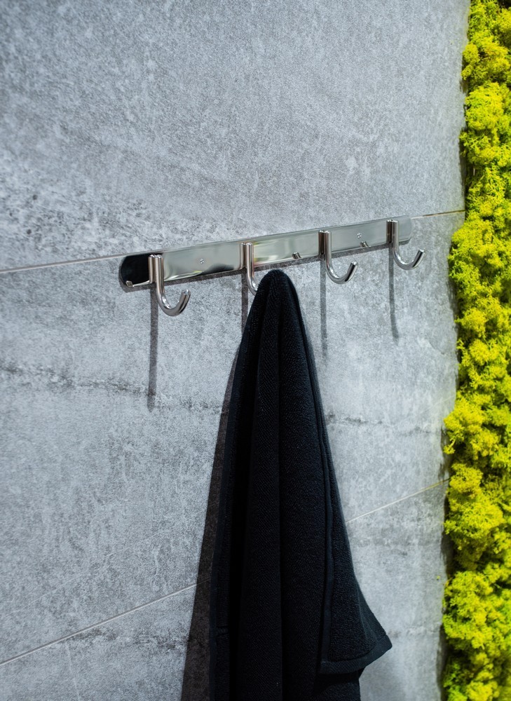 Kúpeľňový vešiak z nerezovej ocele, ktorý má štyri háčiky na zavesenie uterákov, županov alebo oblečenia. Inštalácia pomocou dvoch skrutiek a hmoždiniek, ktoré sú súčasťou balenia.