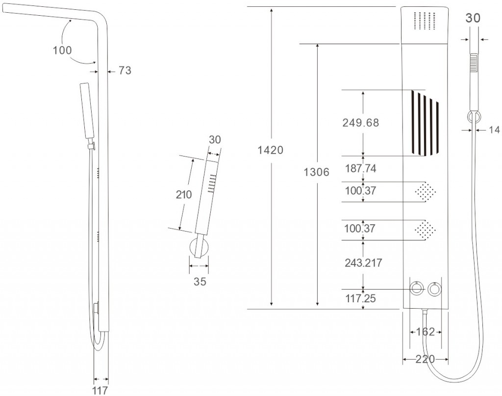 Sprchový panel je vyrobený z nerezovej ocele a opatrený povrchovou úpravou. Panel série NAVAS je dostupný v čiernej farbe. Celková výška panela je 142 cm a šírka 22 cm.
