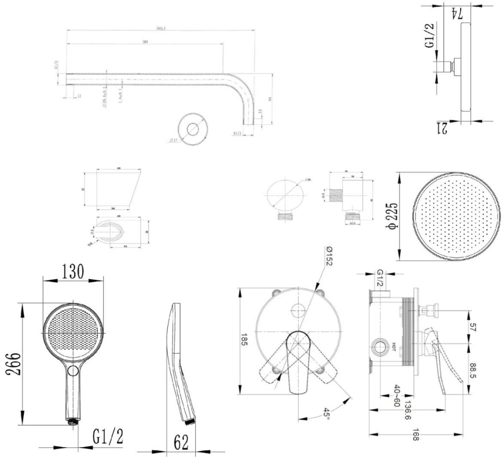 hornú sprchu 225 mm so sprchovým ramenom 350 mm