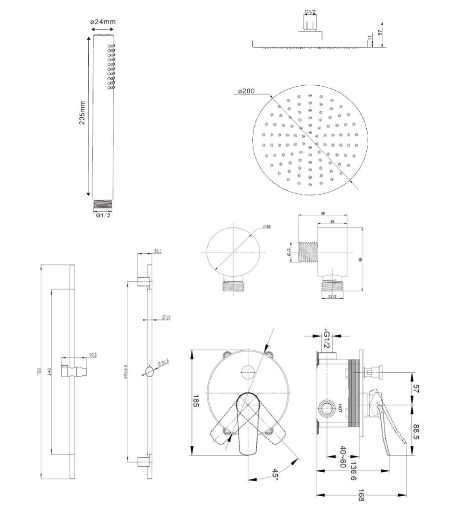 hornú sprchu 200 mm so sprchovým ramenom 350 mm