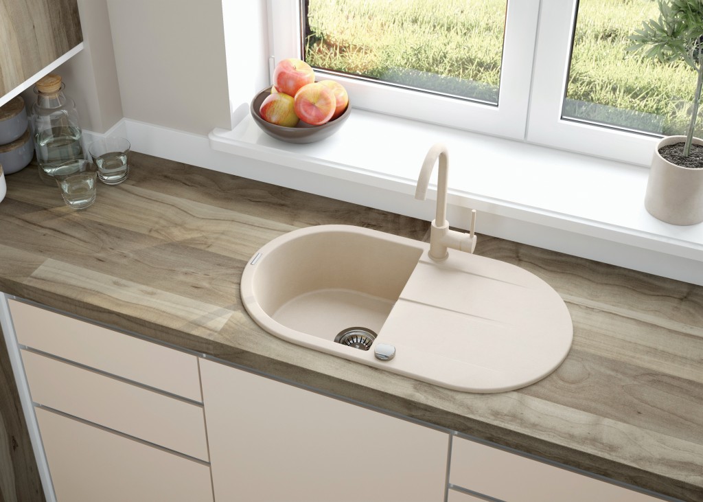 Stojanková drezová batéria Nemezja s výtokom v tvare U v elegantnom alabastrovom prevedení je perfektným riešením pre moderné, svetlé, minimalistické kuchyne. Táto batéria sa vyznačuje vysokým, zaobleným výtokom typu U, pohodlnou pákou umiestnenou na boku a perlátorom, ktorý prúd prevzdušňuje. Béžová drezová batéria z kolekcie Nemezja bude najlepšie vyzerať v kombinácii so svetlým granitovým drezom a svetlou alebo tmavou pracovnou doskou.