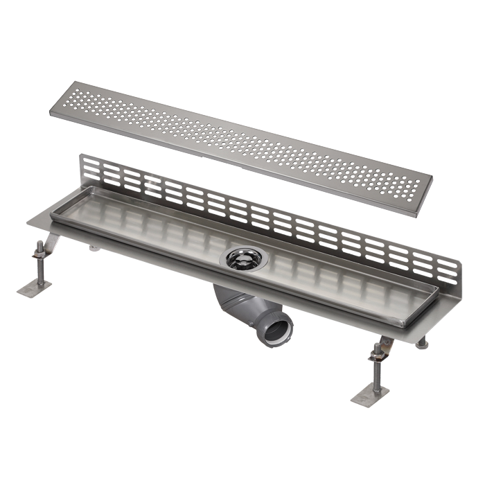 SLKN 08B - obj. č. 69082 - žlábek, mřížka (krycí rošt), sifon se zápachovou uzávěrou, stavitelné šrouby 4x M10, háček pro vyjmutí mřížky