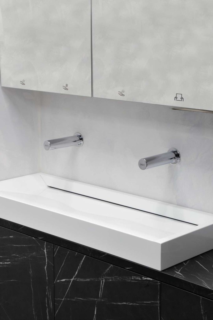 - reaguje na prítomnosť rúk v snímanej zóne pod zrkadlom spustením jednej dávky mydla (čas dávkovanie mydla možné nastaviť v rozsahu 1,3 - 13 s), štandardne 2,6 s