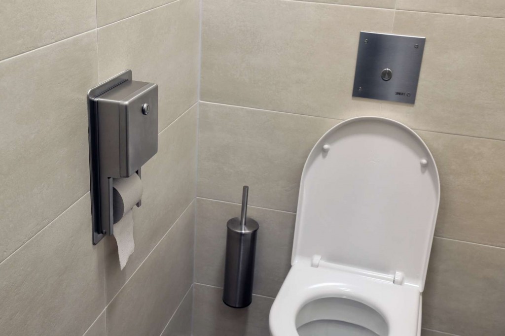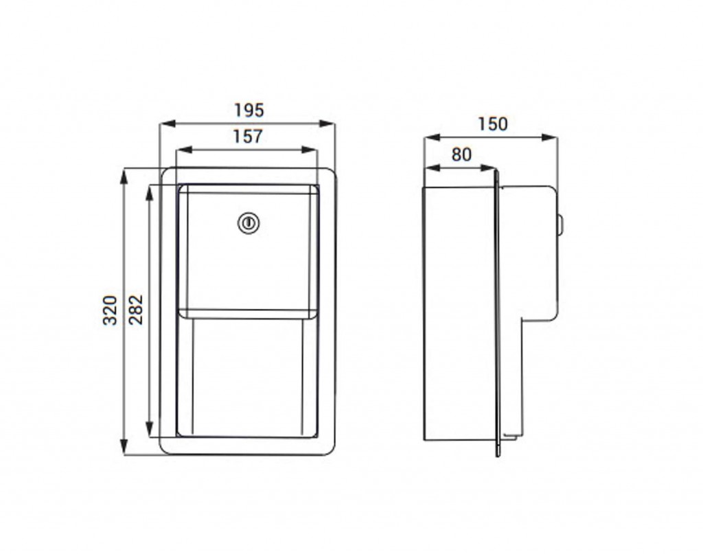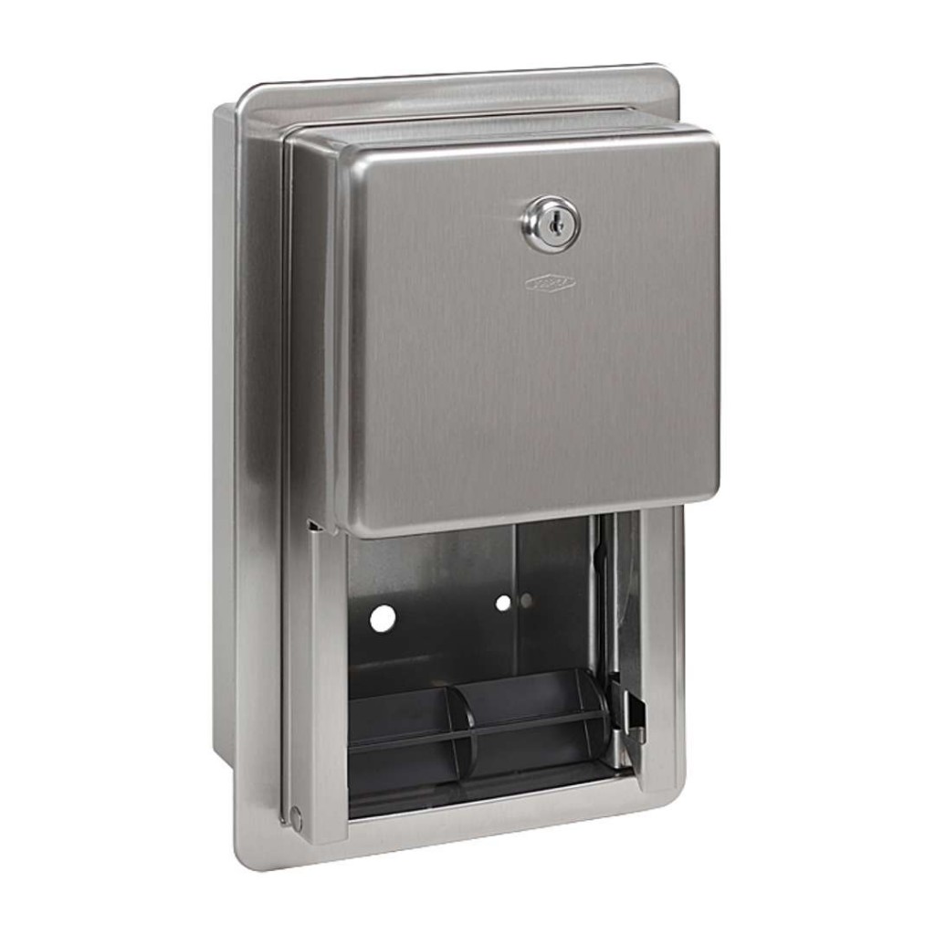 nerezový držiak toaletných rolí k montáži pod omietku, pre dve bežné WC papierové rolky (D = do 135 mm), po použití prvej rola je automaticky doplnená druhá, so zámkom a kľúčom, povrch matný