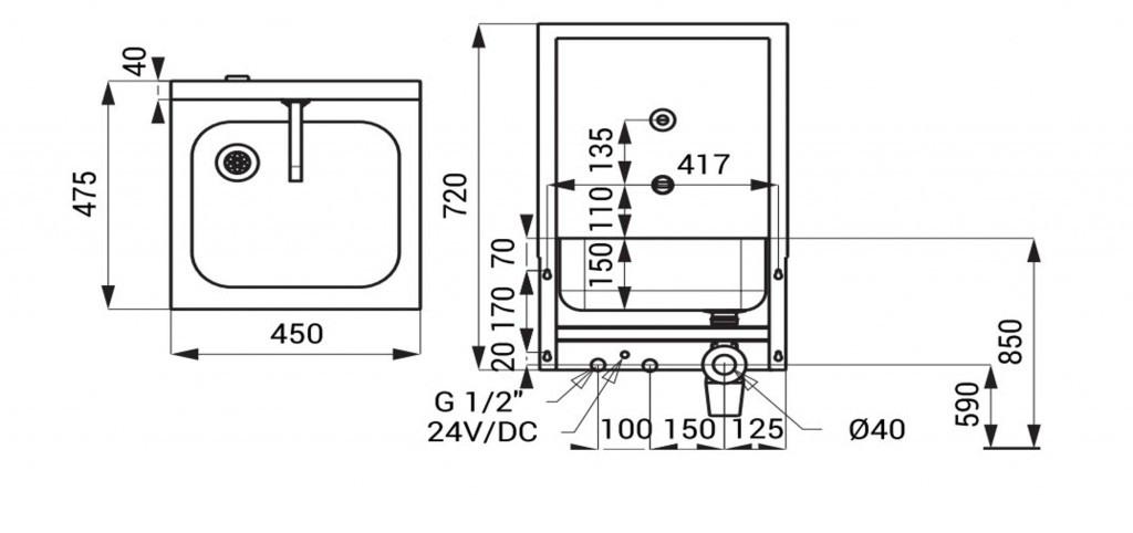 nerezový drez s elektronikou a výtokom, elektromagnetický ventil (1ks), Y-diel, prepojovacie hadice, rohový ventil so spätnou klapkou (2ks), sifón, úchytková sada, napájacia lítiová batéria SLA 09