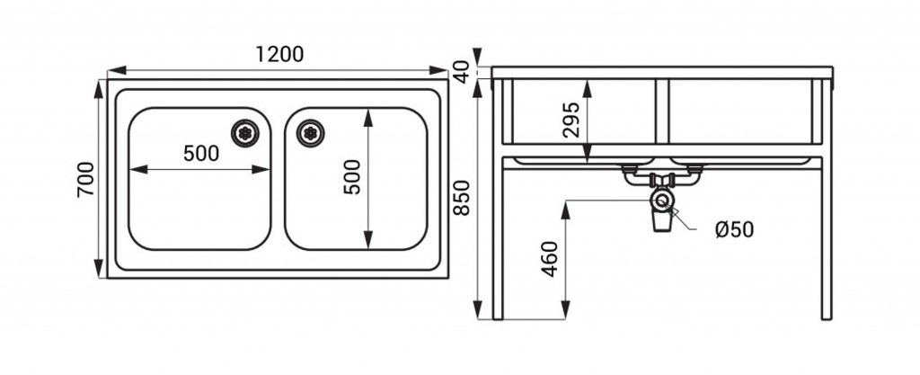 nerezový veľkokapacitný dvojdrez na samonosnej konštrukcii, sifón (možnosť zhotovenia otvoru na objednávku)