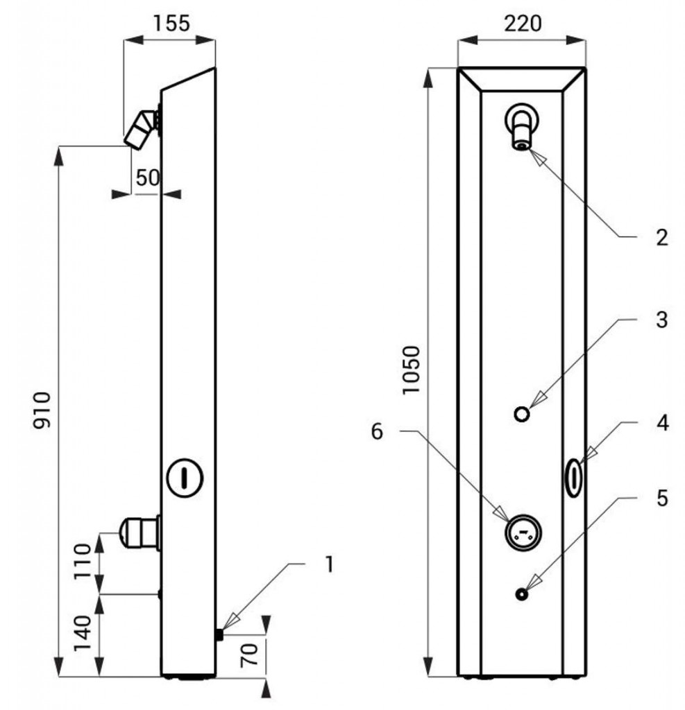 - sprchový panel s elektronikou a zásobníkom na žetóny, sprchová hlavica s nastavením uhla výtoku