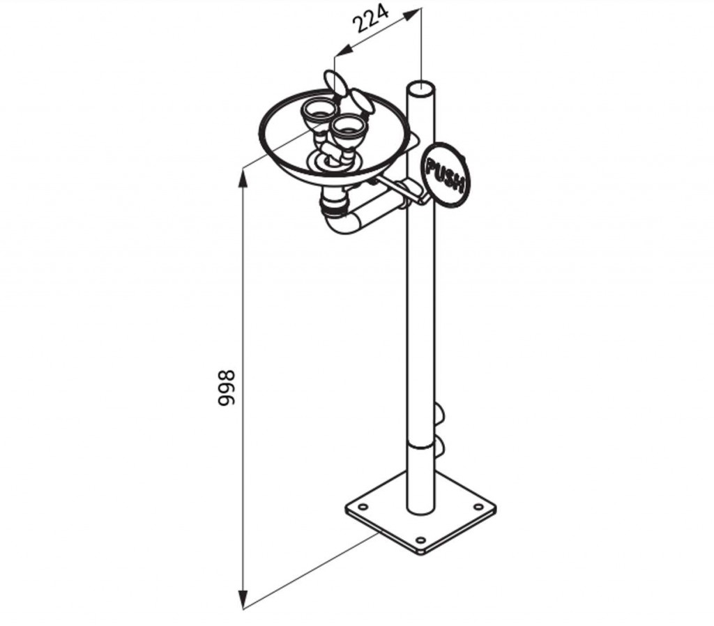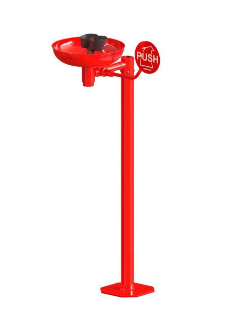 voľne stojace očná sprcha so špeciálnym chemicky odolným červeným lakom s dvoma hlavicami a vaničkou, úchytový materiál, dodávané bez sifónu