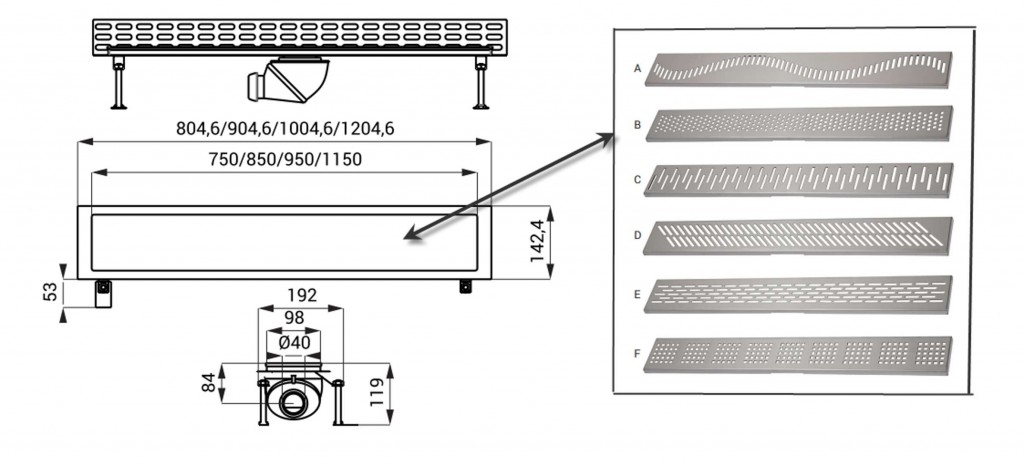 odpad uprostred, možnosť nastavenia smeru a sklonu odtoku (umiestnenie odpadu mimo stred je možné dodať na zákazku)