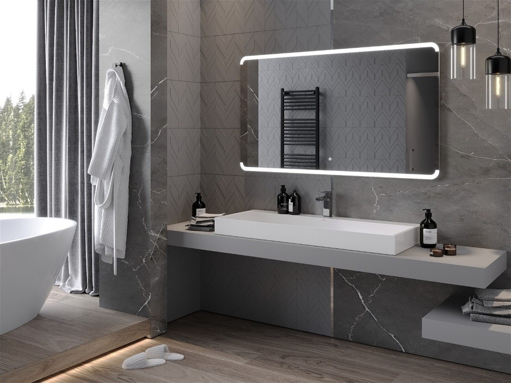 Moderné a jednoduché zrkadlo kolekcie NIDA je vybavené LED podsvietením, ktoré sa ľahko ovláda pomocou dotykového tlačidla priamo na ploche zrkadla . Zrkadlo je vybavené vyhrievacou podložkou ANTI-CAR , ktorá eliminuje zahmlenie skla.