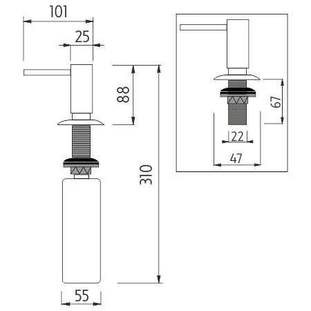NIMCO Dávkovač tekutého mydla O pumpy 25mm chróm UN 2031V-26 Vstavaný dávkovač na tekuté mydlo alebo prostriedok na umývanie riadu. Hlava pumpy priemer 25mm