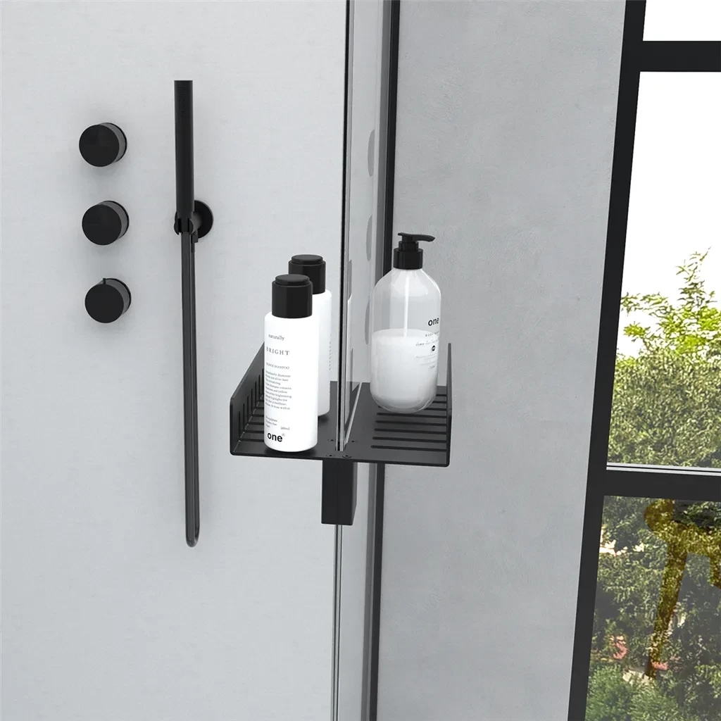 Praktická polička na sklo otvoreného sprchovacieho kúta v jednoduchom modernom dizajne bez vŕtania.