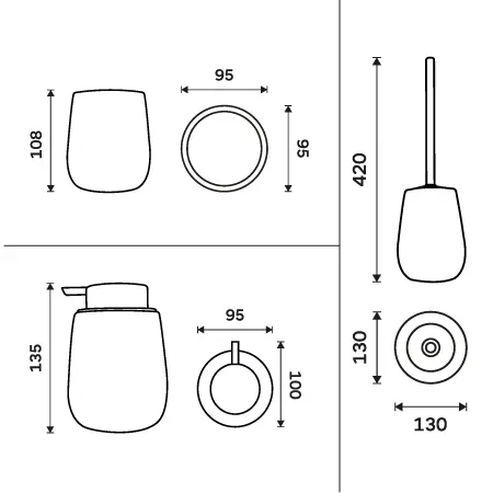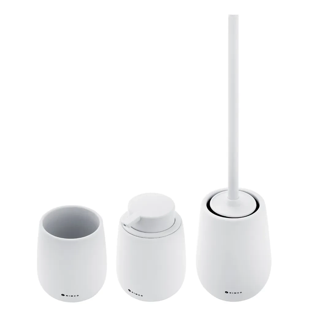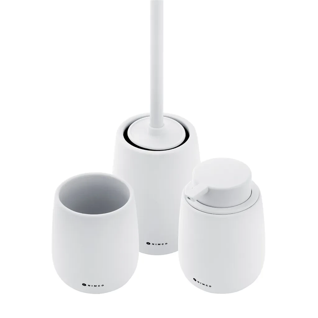 Sada doplnkov do kúpeľne a WC obsahuje dávkovač tekutého mydla, pohárik na zubné kefky a WC kefu. Nádobky keramické biele matné. "Soft-touch" povrch. Špeciálna dodatočná povrchová úprava. Povrch je hebký, príjemný na dotyk.