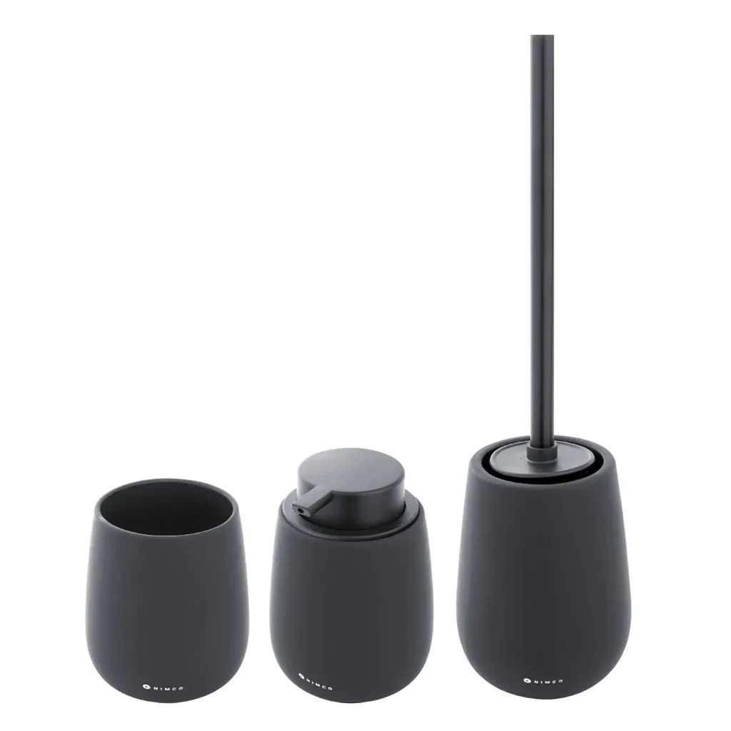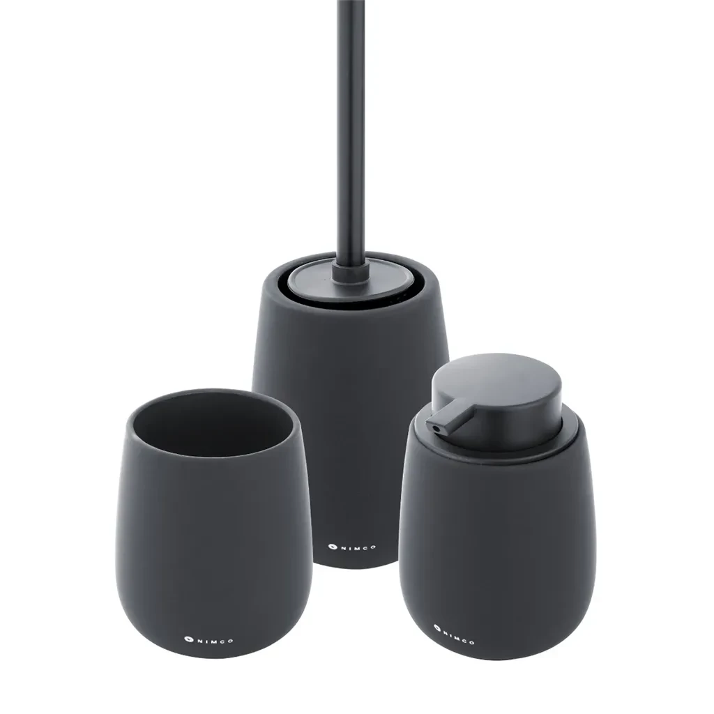 V sade dávkovač tekutého mydla, pohárik na kefky a WC kefa. Nádobky keramické čierne matné. Objem dávkovača 425 ml. Pumpička plast. Rukoväť kefy nerez oceľ. "Soft touch" povrch.