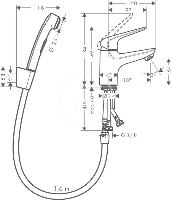 Páková umývadlová batéria s ručnou sprchou bidety a hadicou
