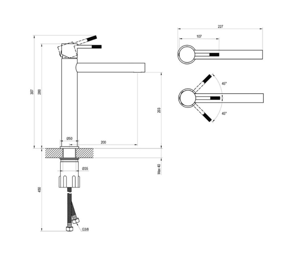 - pripojenie G 3/8", flexibilné hadičky 450 mm