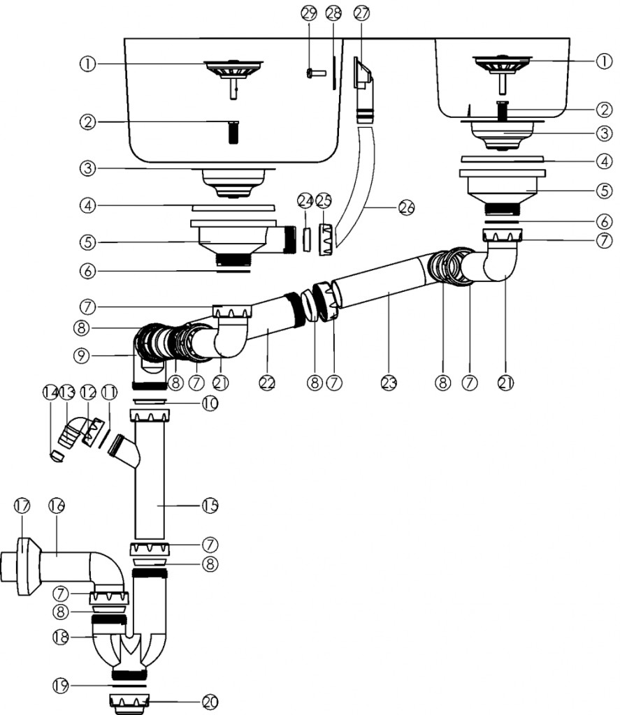 Sifón na dvojitý drez, odpad drezu 89mm prepad z drezu