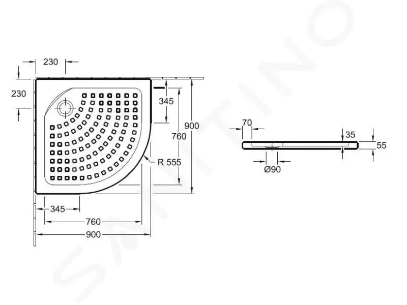 Štvrťkruhová sprchová vanička s drobnými protišmykovými výstupkami