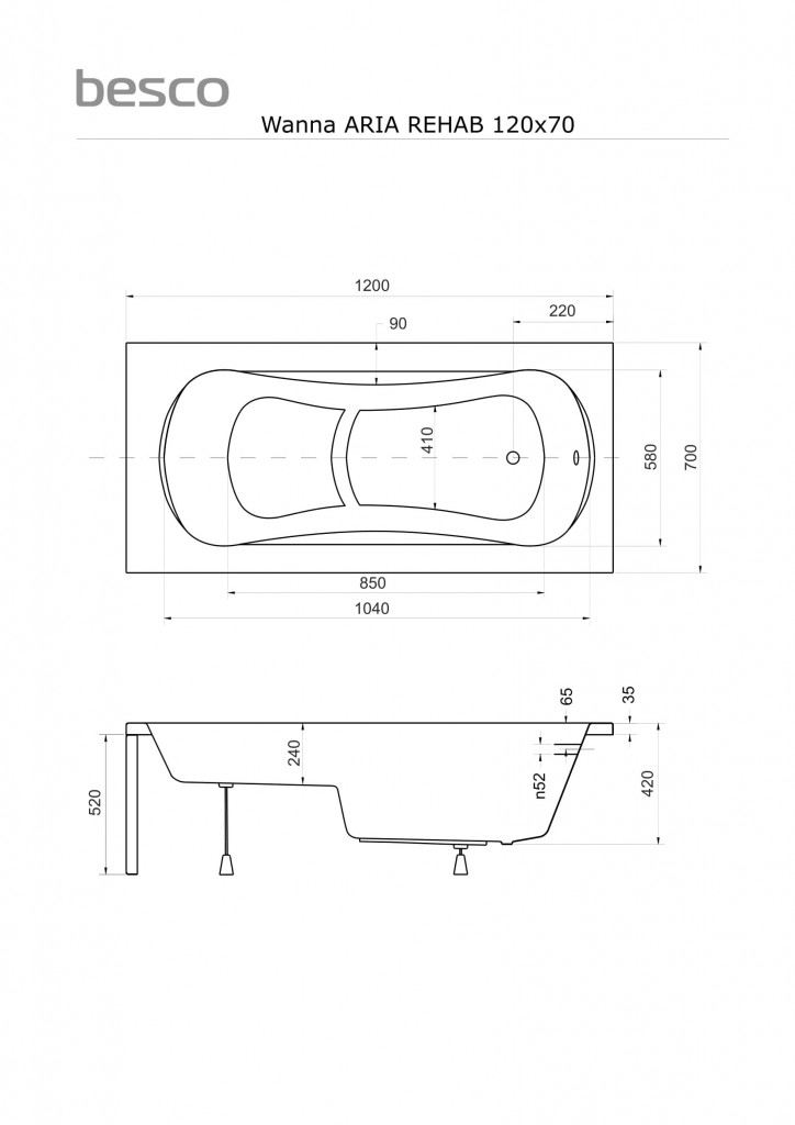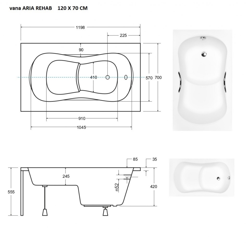 Obdĺžniková vaňa ARIA Rehab vyniká vysoko kvalitným spracovaním a spoľahlivú funkčnosťou všetkých súčastí a materiálov. Nožičky k vani je nutné dokúpiť.