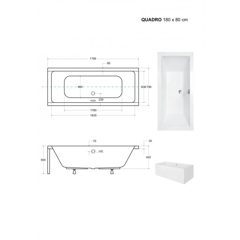 Tvarovo jednoduchá vaňa QUADRO s ostrými zvýraznenými hranami, osloví všetkých zákazníkov, ktorí uprednostňujem rovné línie. Vaňa QUADRO s veľkými vnútornými rozmermi, ktorá ponúka obojstranné veľmi pohodlné ležanie. Nožičky k vani je nutné dokúpiť. Túto vaňu možné za príplatok objednať s povrchovou úpravou BeSafe *.