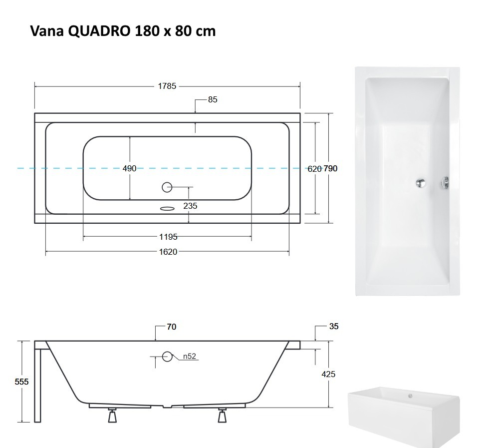 Tvarovo jednoduchá vaňa QUADRO s ostrými zvýraznenými hranami, osloví všetkých zákazníkov, ktorí uprednostňujem rovné línie. Vaňa QUADRO s veľkými vnútornými rozmermi, ktorá ponúka obojstranné veľmi pohodlné ležanie. Nožičky k vani je nutné dokúpiť. Túto vaňu možné za príplatok objednať s povrchovou úpravou BeSafe *.
